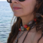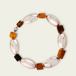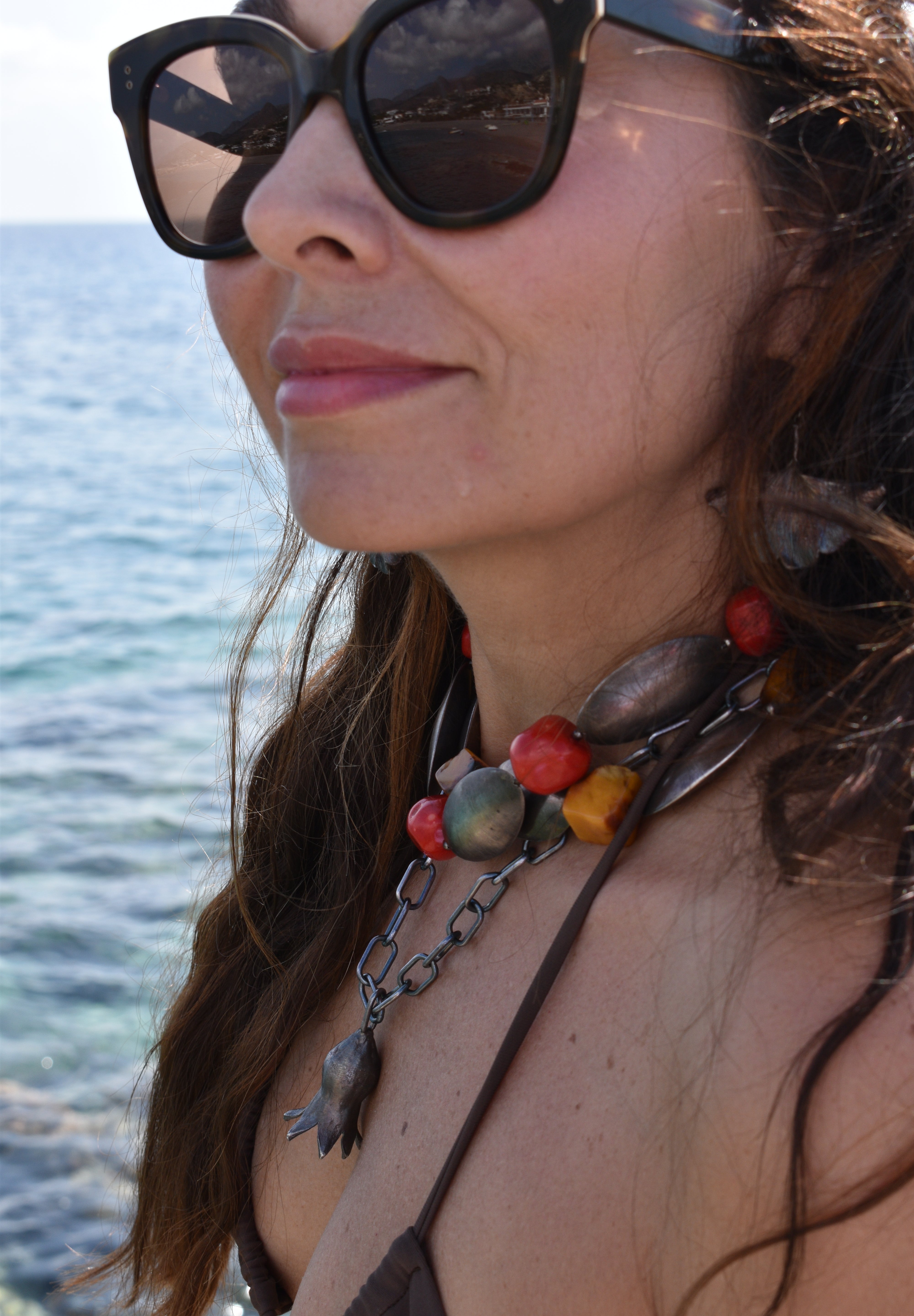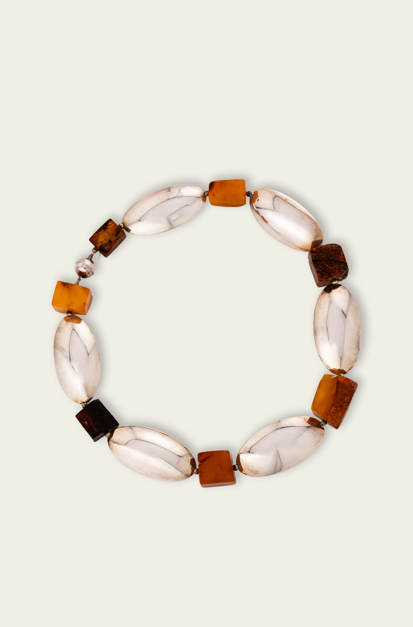 Naszyjnik z kolekcji Ovalis powstał z połączenia srebra oraz naturalnych bursztynów.