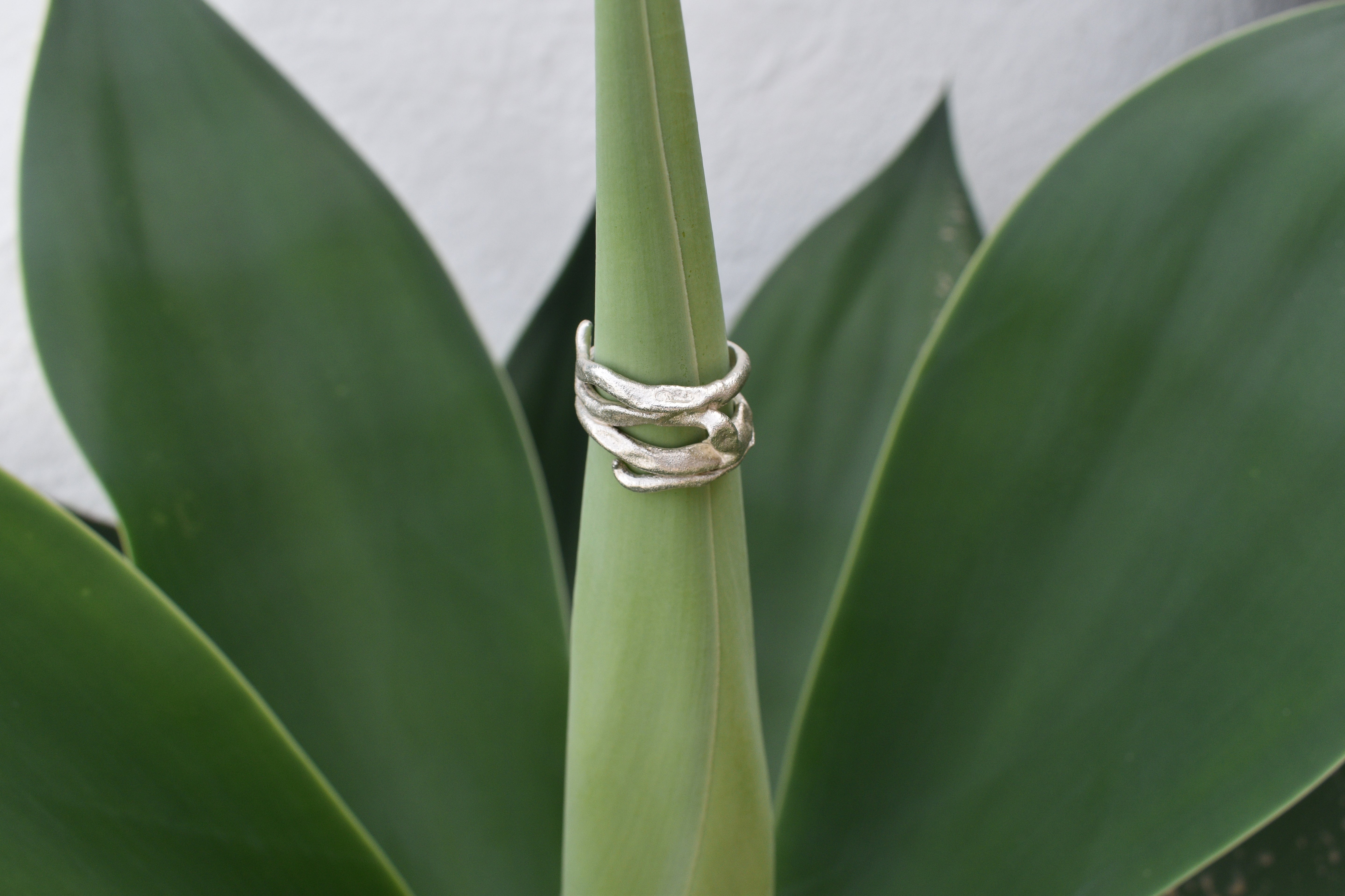 Pierścionek z kolekcji Edera wykonany ze srebra, inspirowany fragmentem rośliny bluszcz. Przyciąga uwagę swoją niecodzienną, rzeźbiarską formą. Pierścionek jest bardzo kobiecy i elegancki, dlatego będzie pasować zarówno na wieczorne wyjścia, jak i spotkania biznesowe. Możemy je również łączyć ze sobą kolorystycznie, wspaniale wyglądają również z innymi pierścionkami.