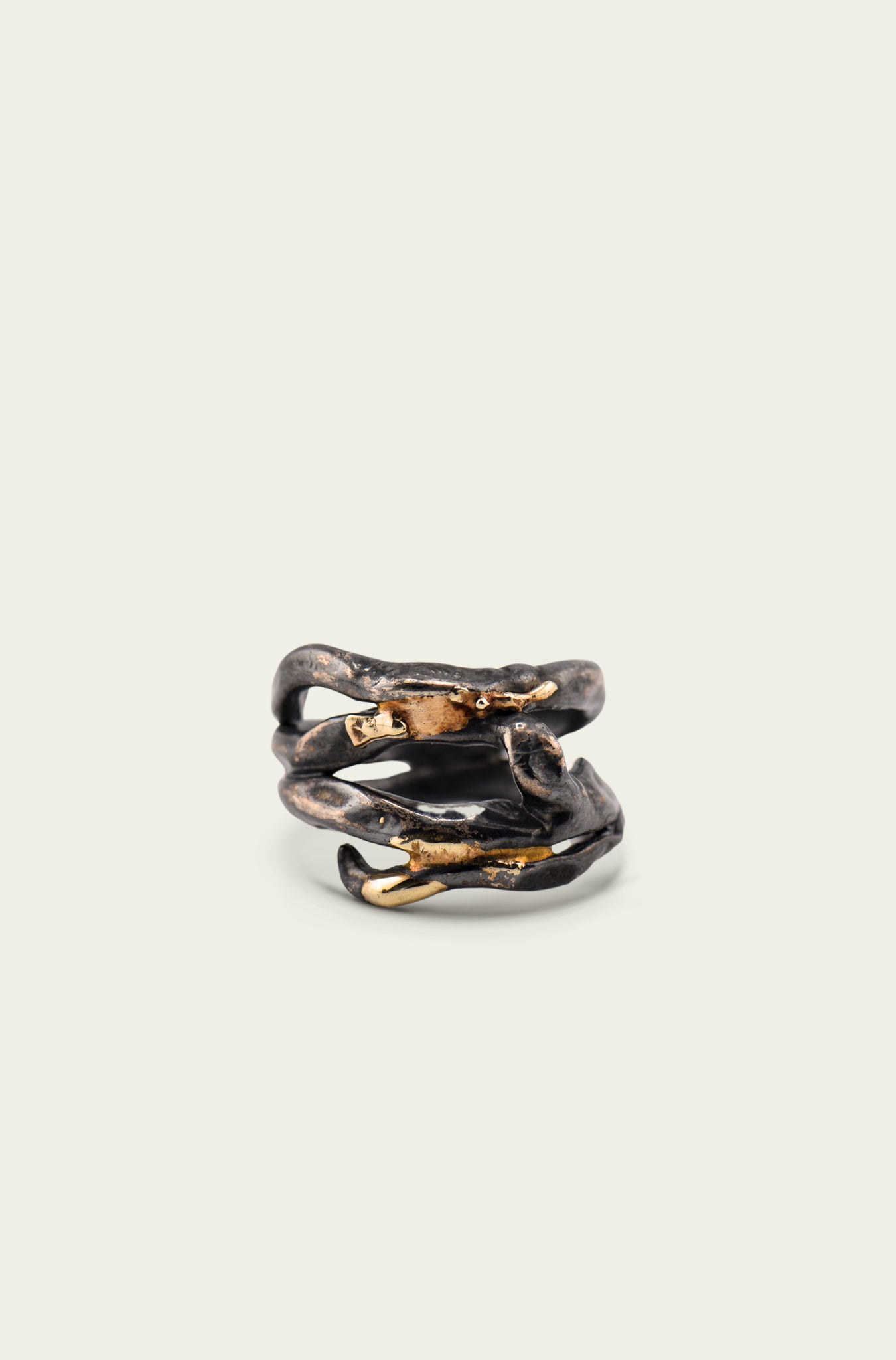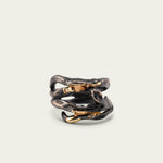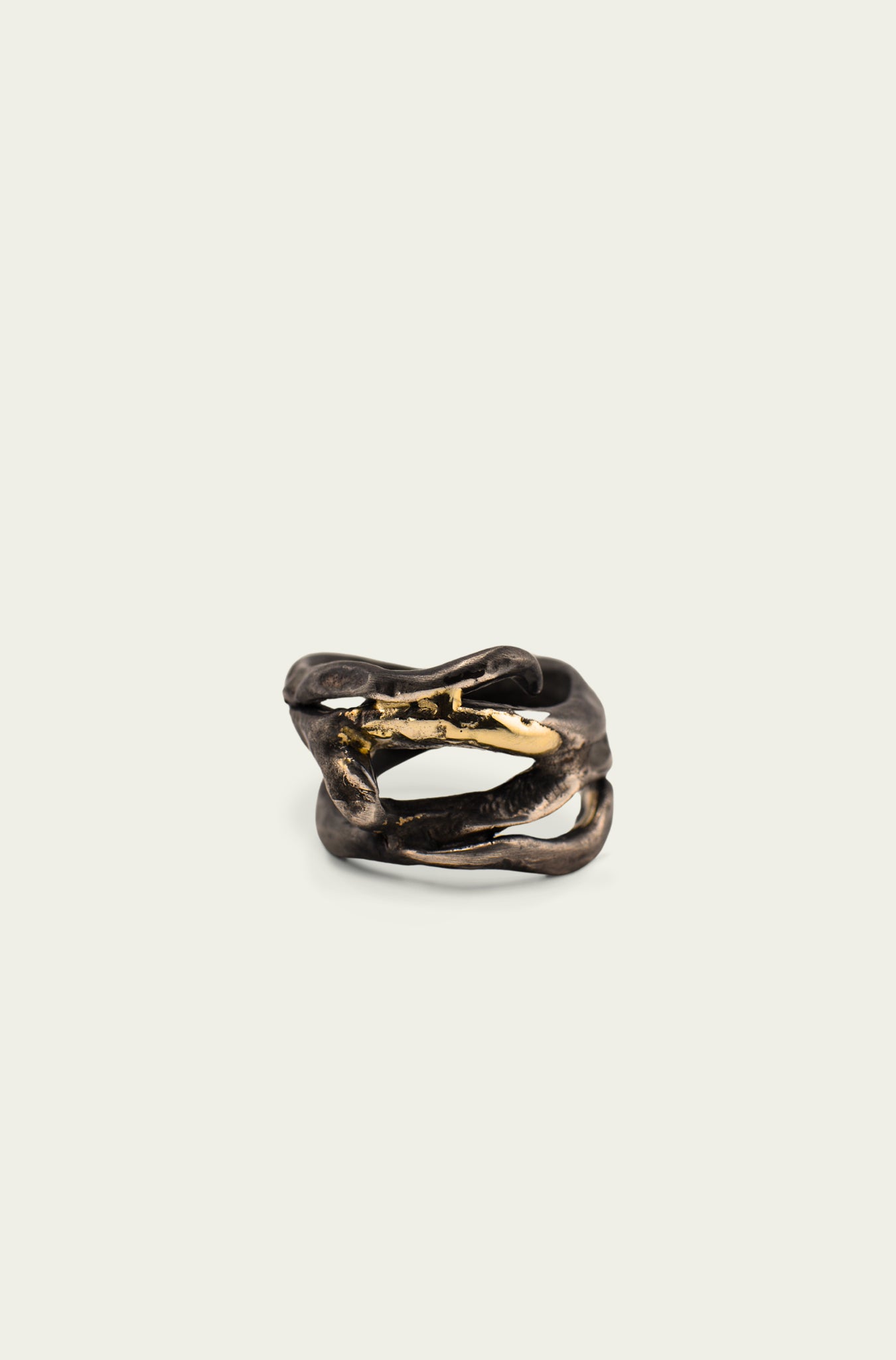 Pierścionek z kolekcji Edera wykonany ze srebra i złota, inspirowany fragmentem rośliny bluszcz. Przyciąga uwagę swoją niecodzienną, rzeźbiarską formą. Pierścionek jest bardzo kobiecy i elegancki, dlatego będzie pasować zarówno na wieczorne wyjścia, jak i spotkania biznesowe. Możemy je również łączyć ze sobą kolorystycznie, wspaniale wyglądają również z innymi pierścionkami.