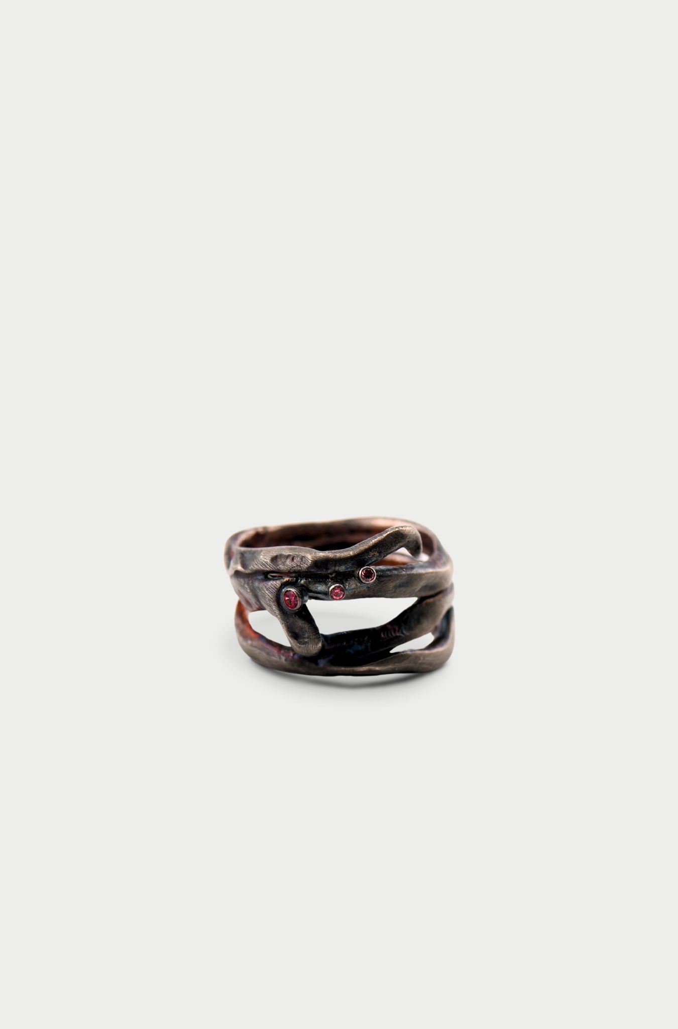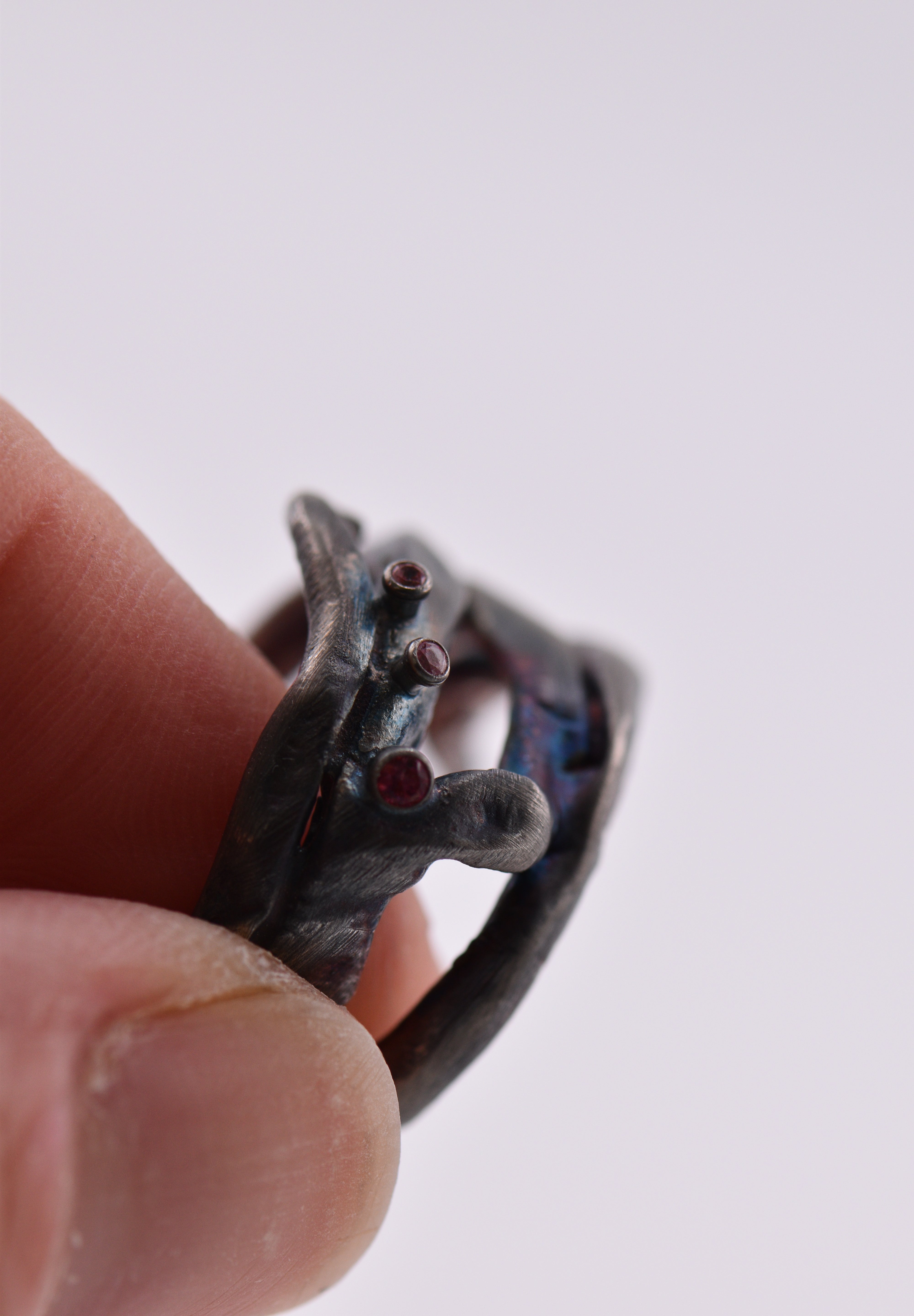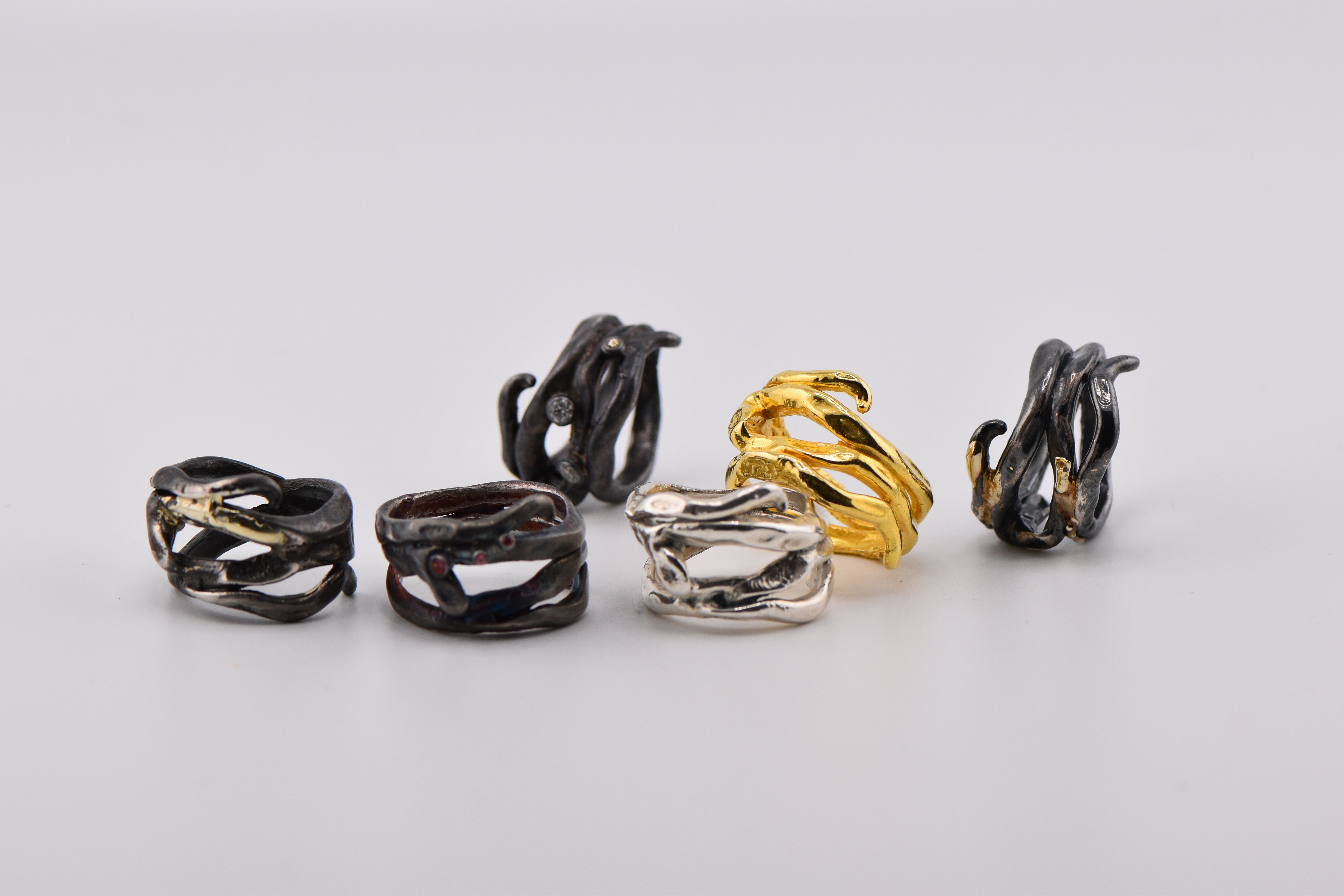 Pierścionek z kolekcji Edera wykonany ze srebra, inspirowany fragmentem rośliny bluszcz. Przyciąga uwagę swoją niecodzienną, rzeźbiarską formą. Pierścionek jest bardzo kobiecy i elegancki, dlatego będzie pasować zarówno na wieczorne wyjścia, jak i spotkania biznesowe. Możemy je również łączyć ze sobą kolorystycznie, wspaniale wyglądają również z innymi pierścionkami.