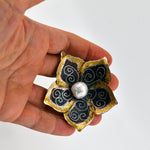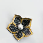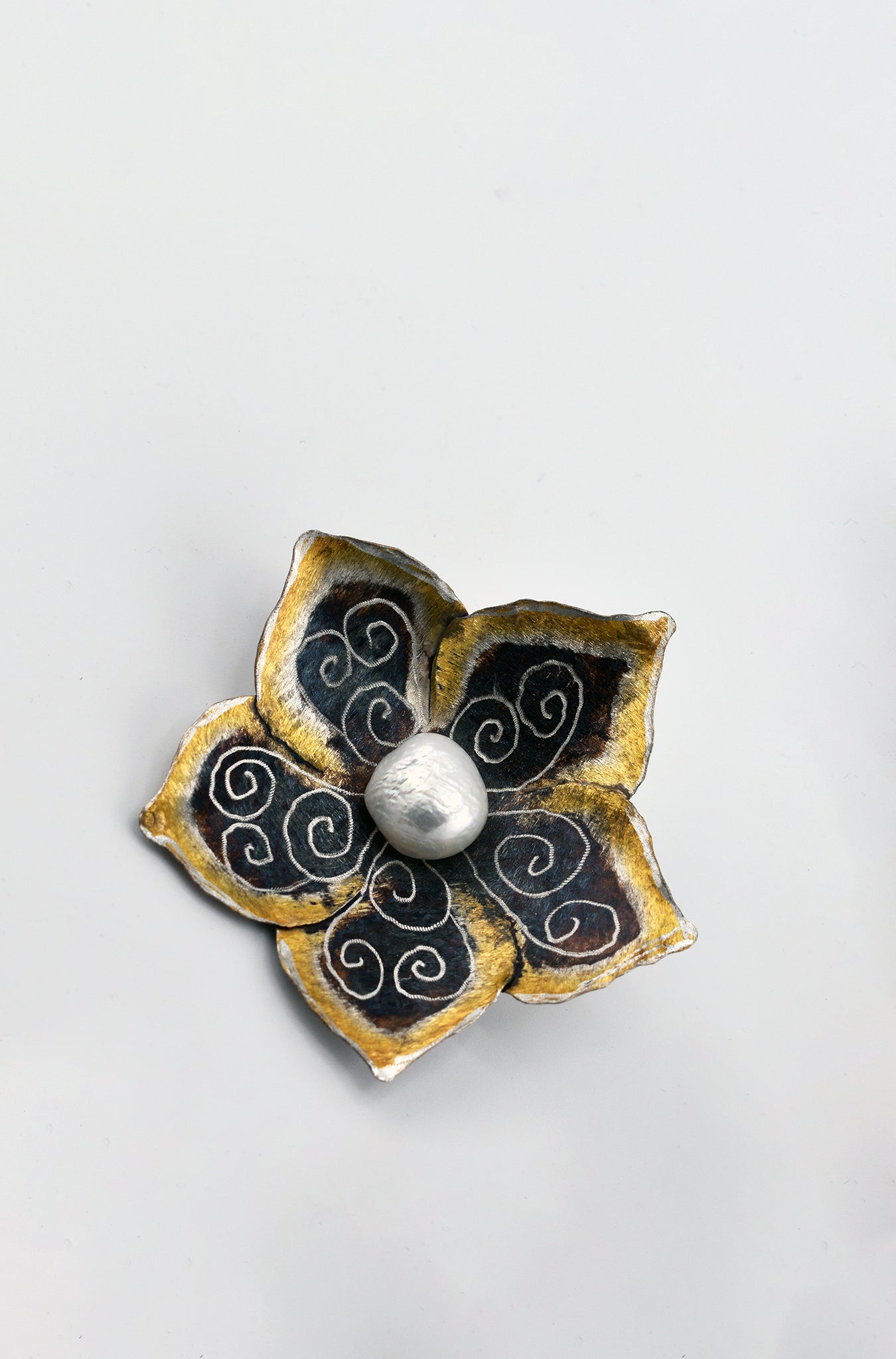 The brooch from the Flower collection is made entirely of gold-plated silver with the addition of a white pearl.
