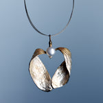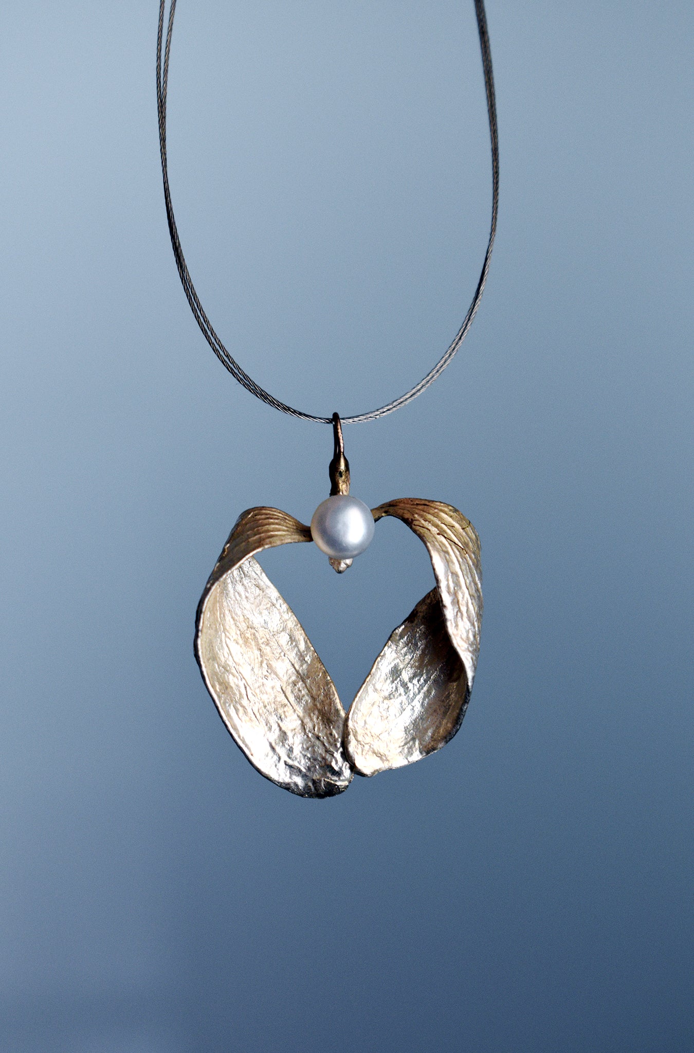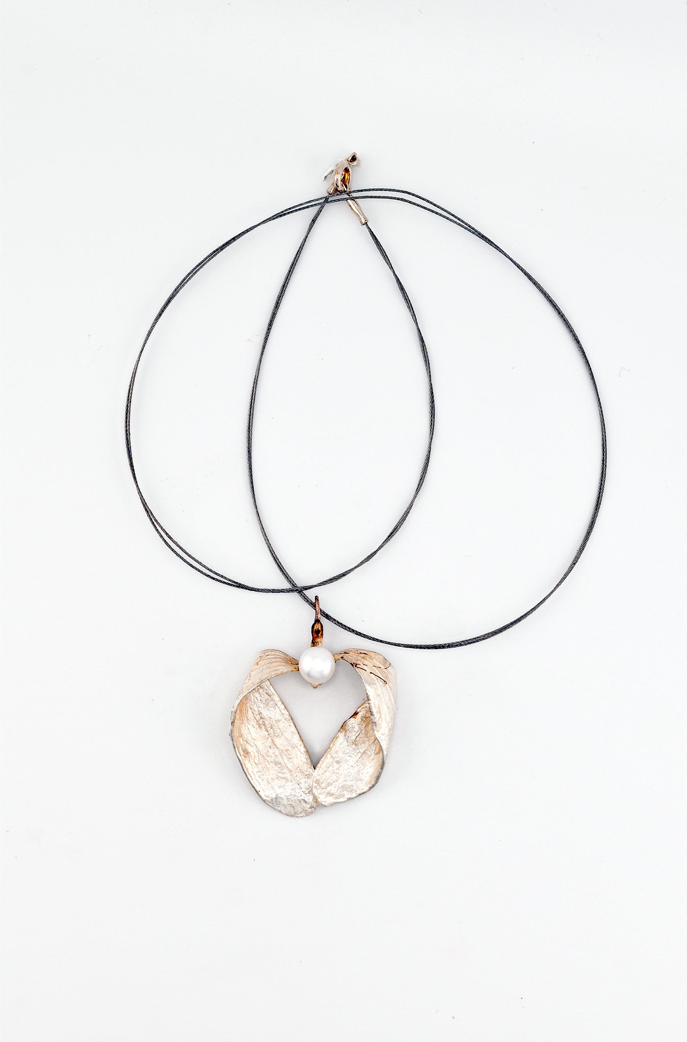 Delikatny naszyjnik ze srebrną jemiołą ozdobioną wewnątrz perłą na lince ze sztali szlachetnej.