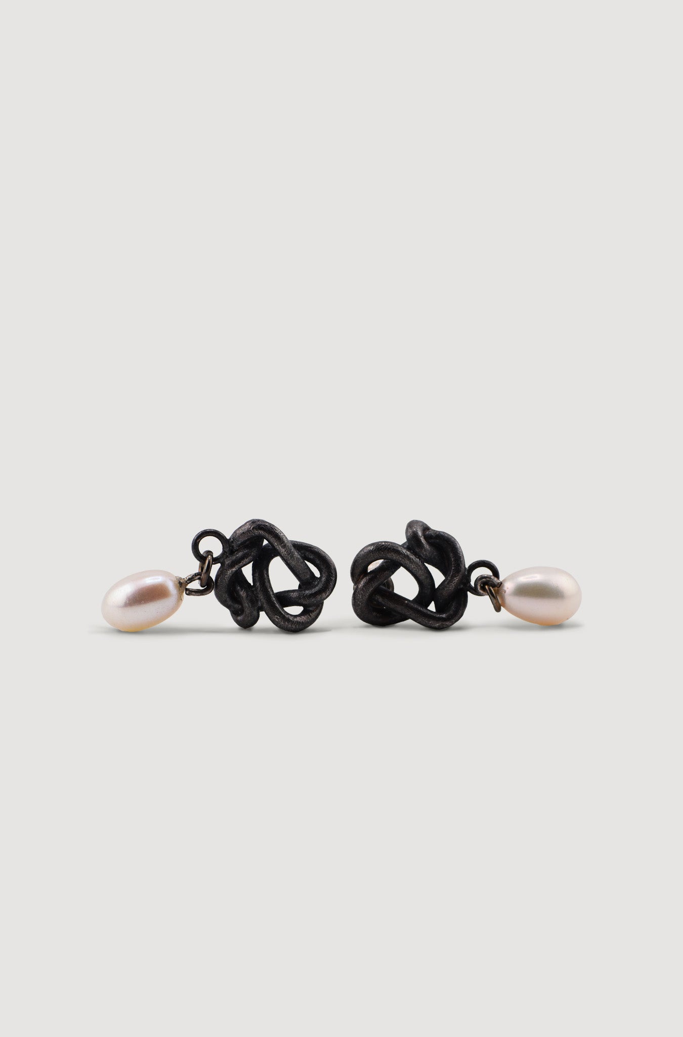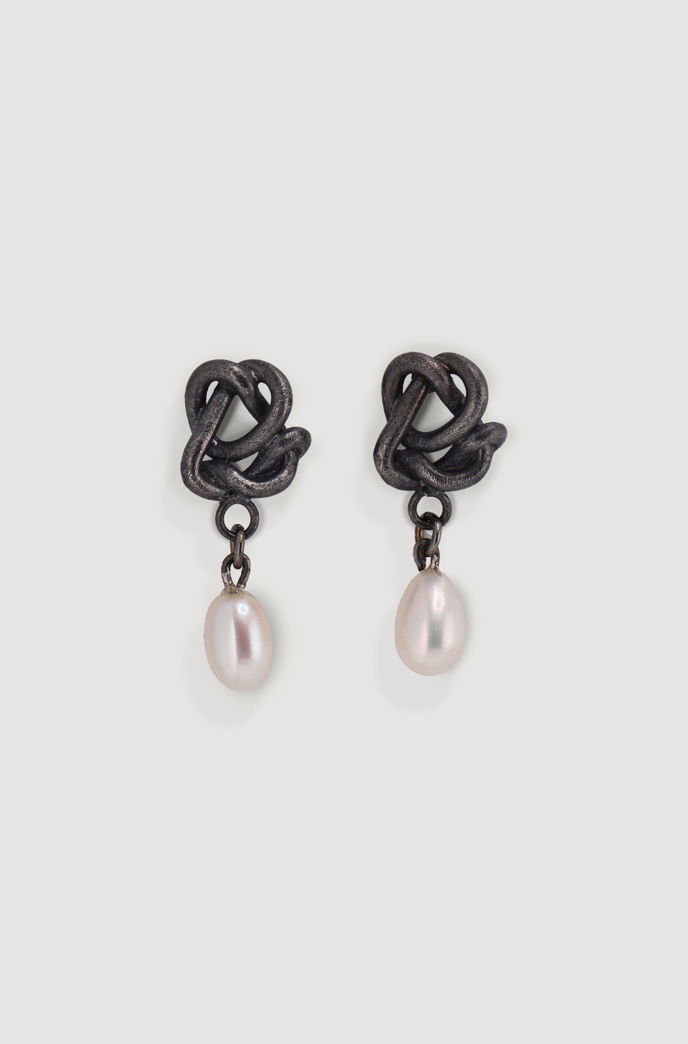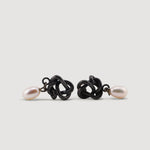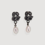Kolczyki Ravel Pearl proste i miękkie w formie. Zostały wykonane ze srebra oksydowanego i pereł.