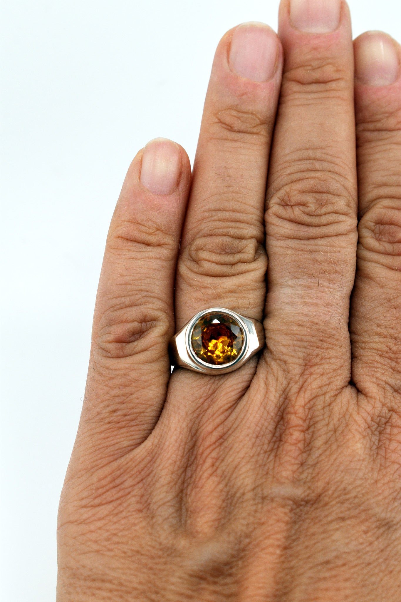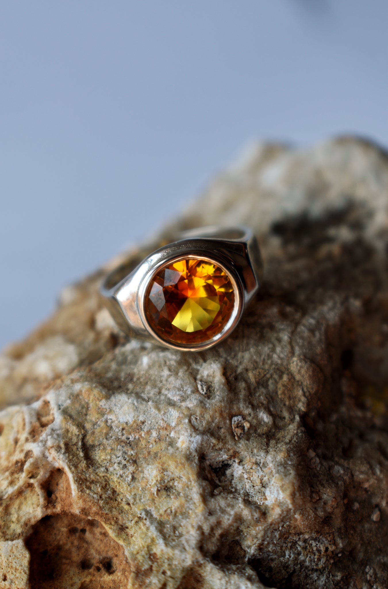 Sygnet w całości wykonany ze srebra zdobiony pomarańczowym kamieniem cyrkonii.