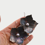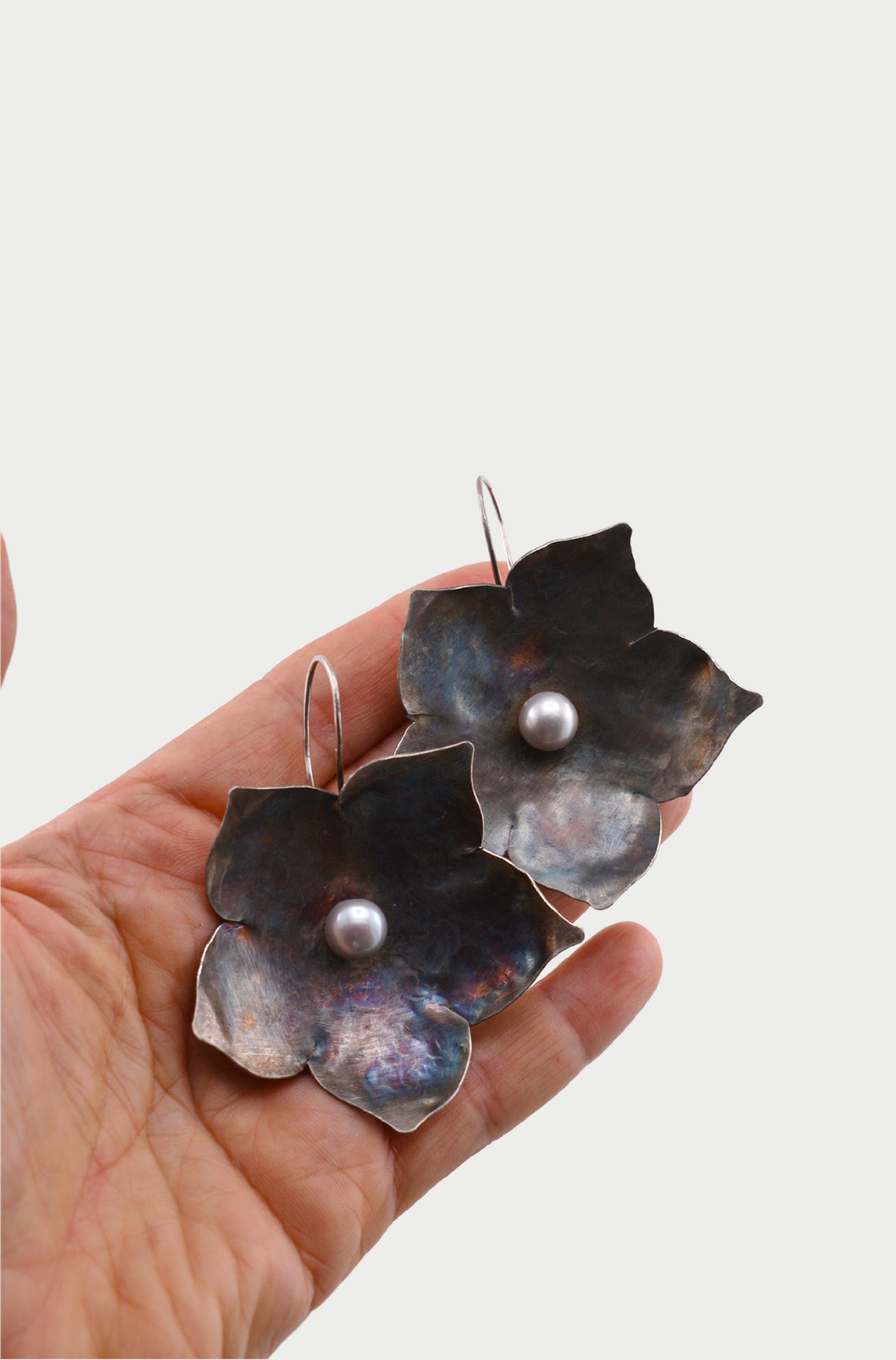 Kolczyki z kolekcji Flower zostały wykonane ze srebra oksydowanego ozdobione wewnątrz naturalną perłą.