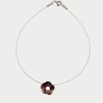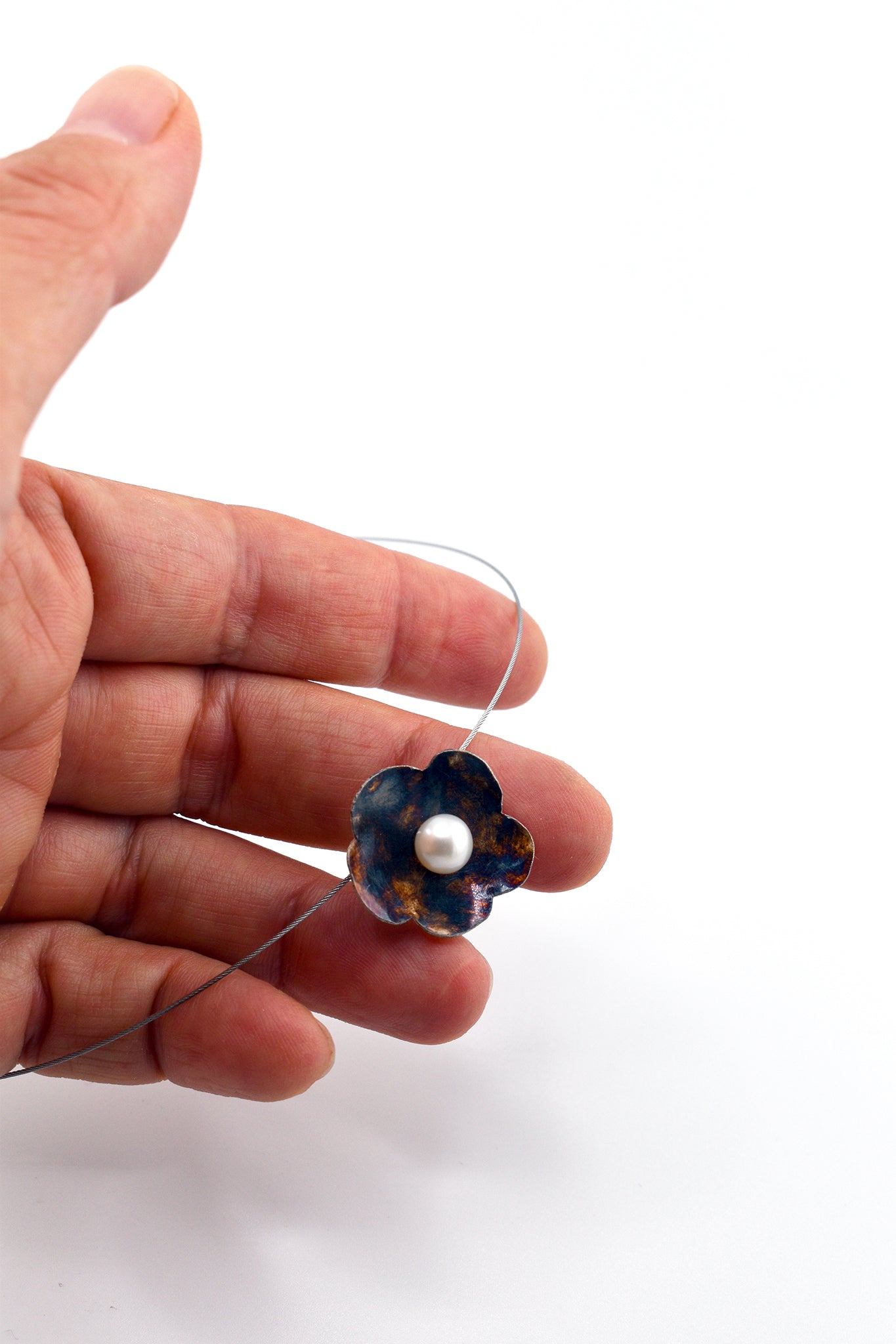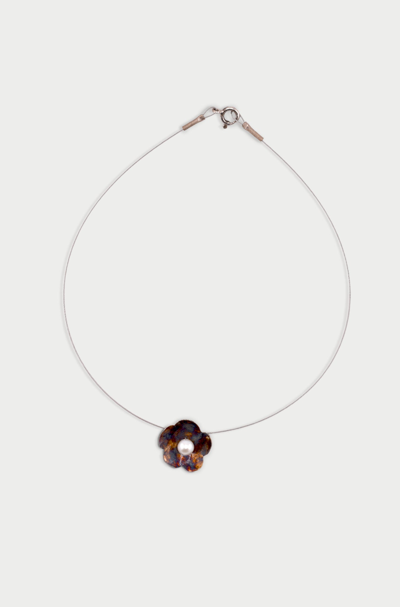 Naszyjnik na stalowej lince ze srebrnym, oksydowanym kwiatem i naturalną perłą hodowlaną.