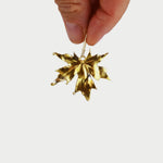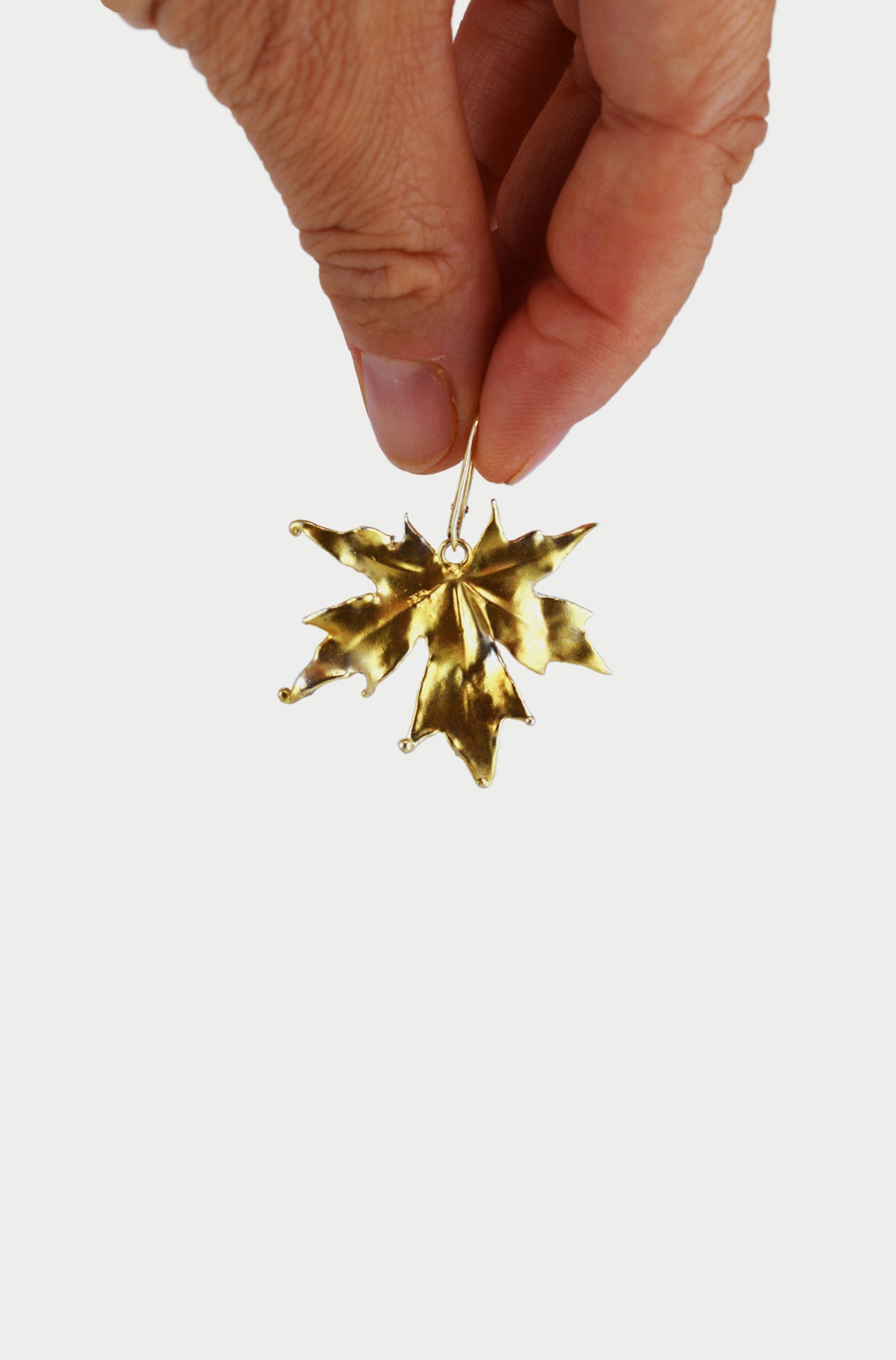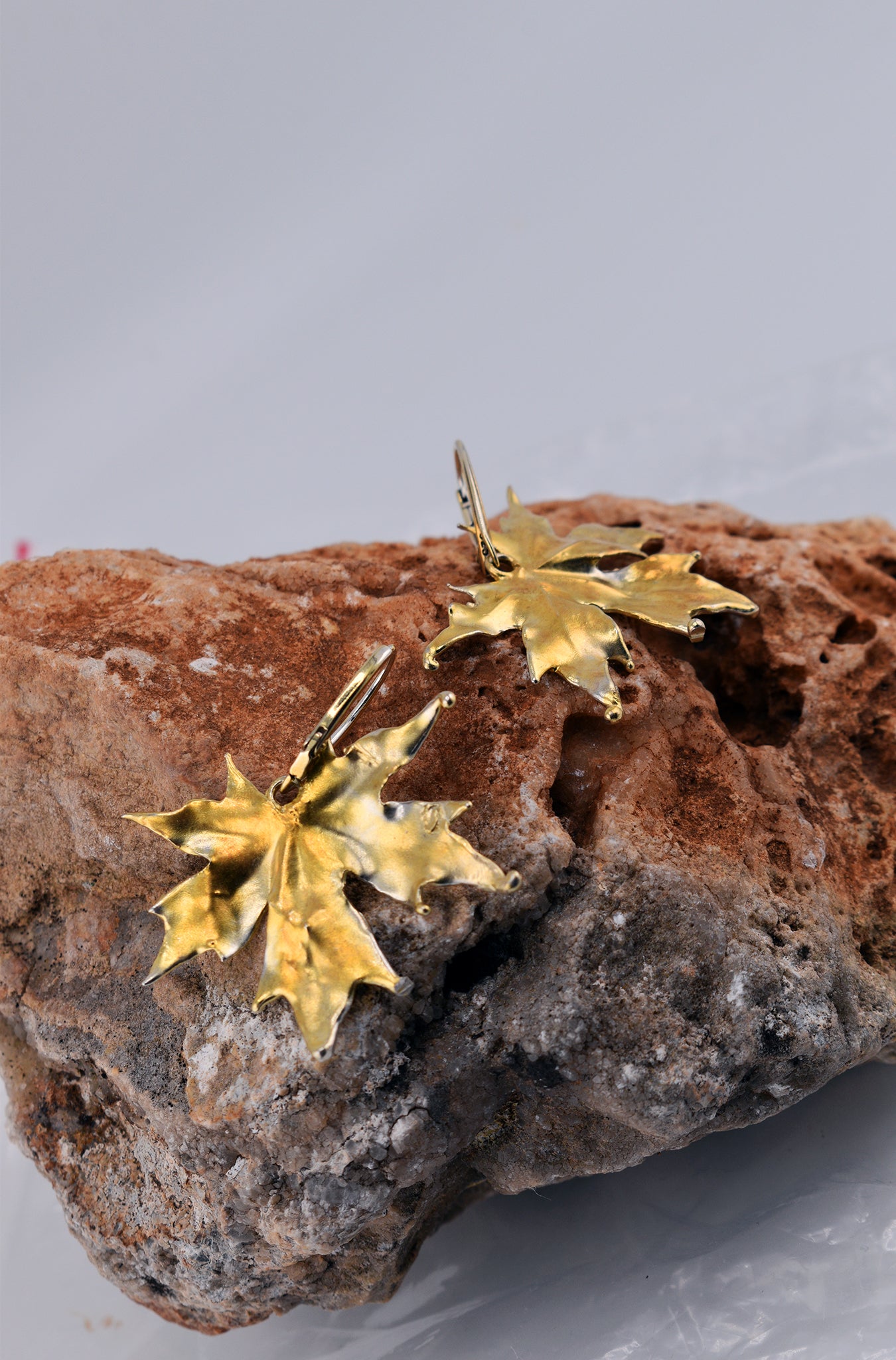 Kolczyki wykonane w całości ze srebra o kształcie liści klonowych, częściowo pozłacane.
