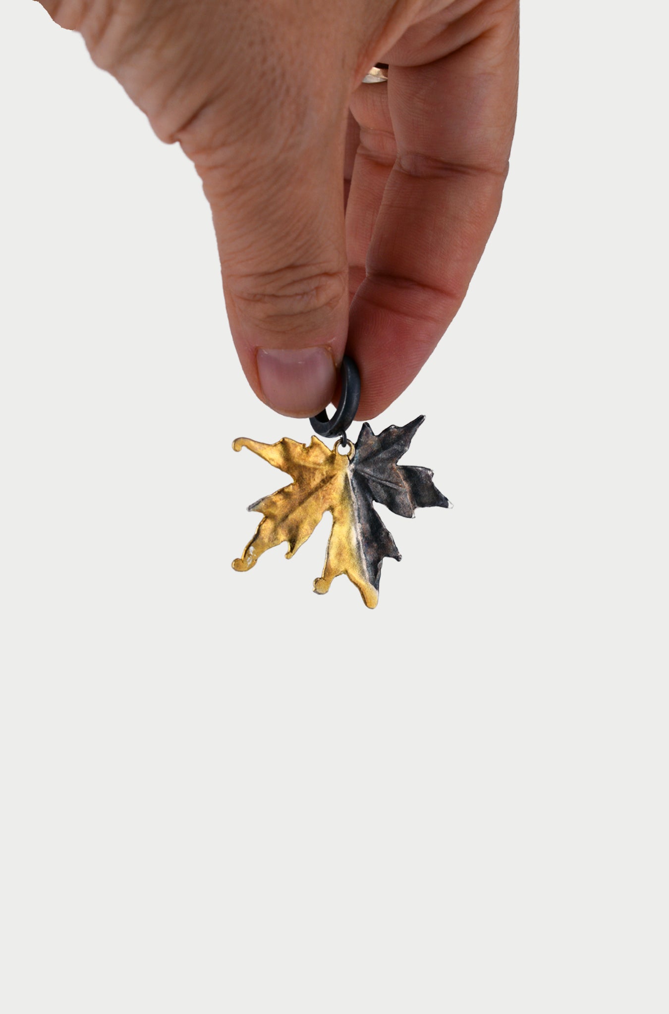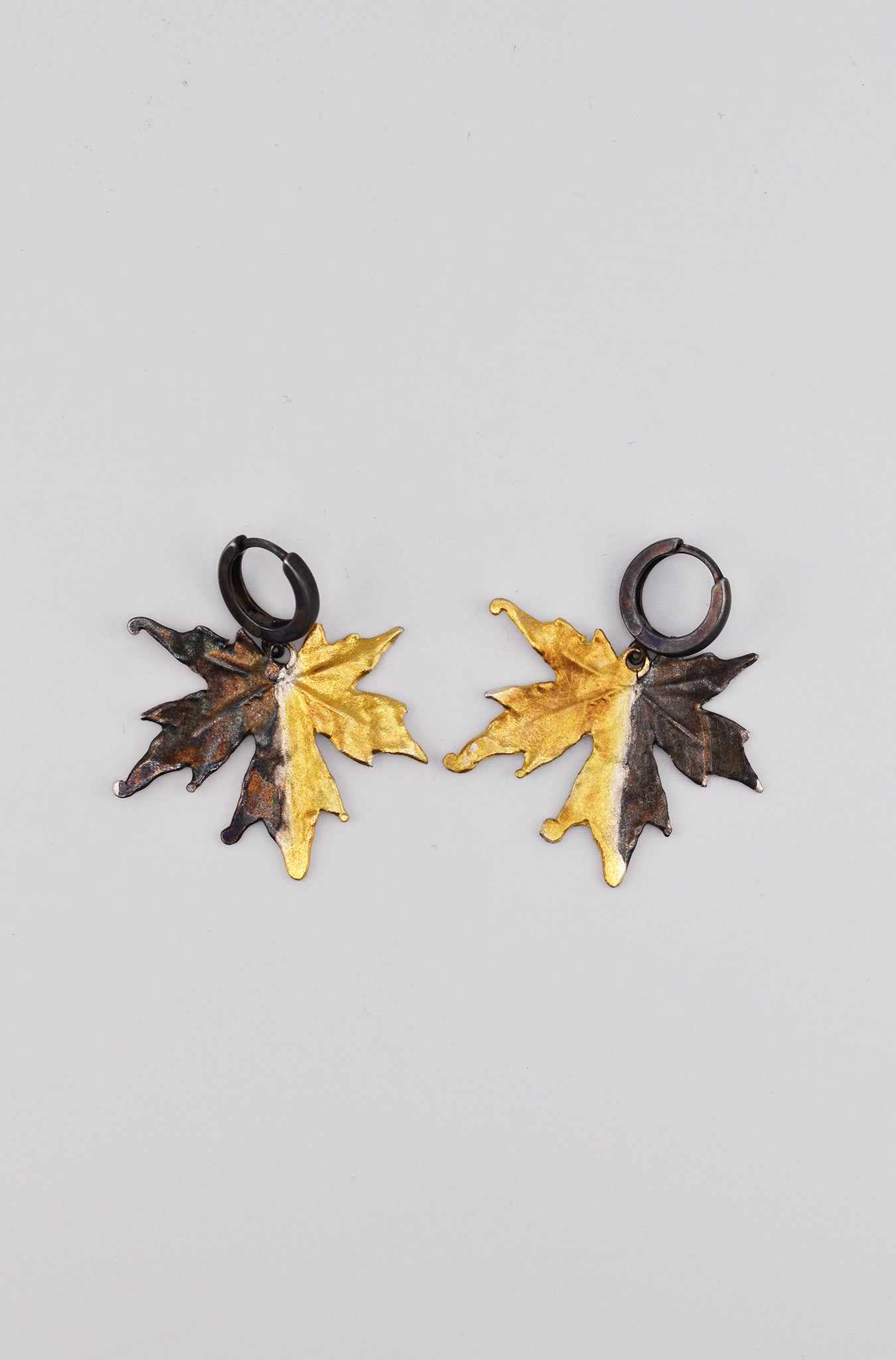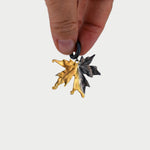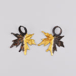 Kolczyki wykonane w całości ze srebra o kształcie liści klonowych, w połowie pozłacane i oksydowane.
