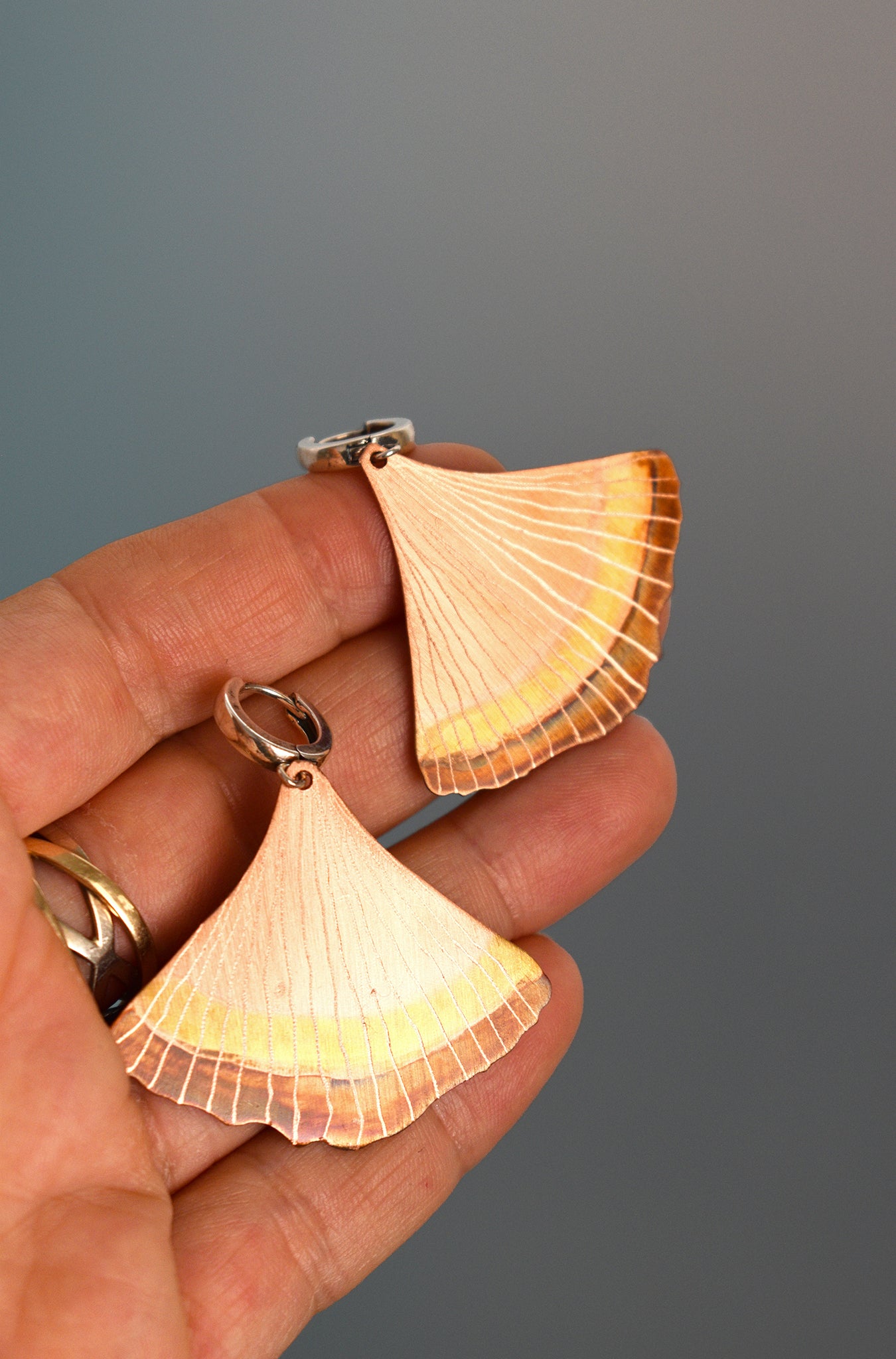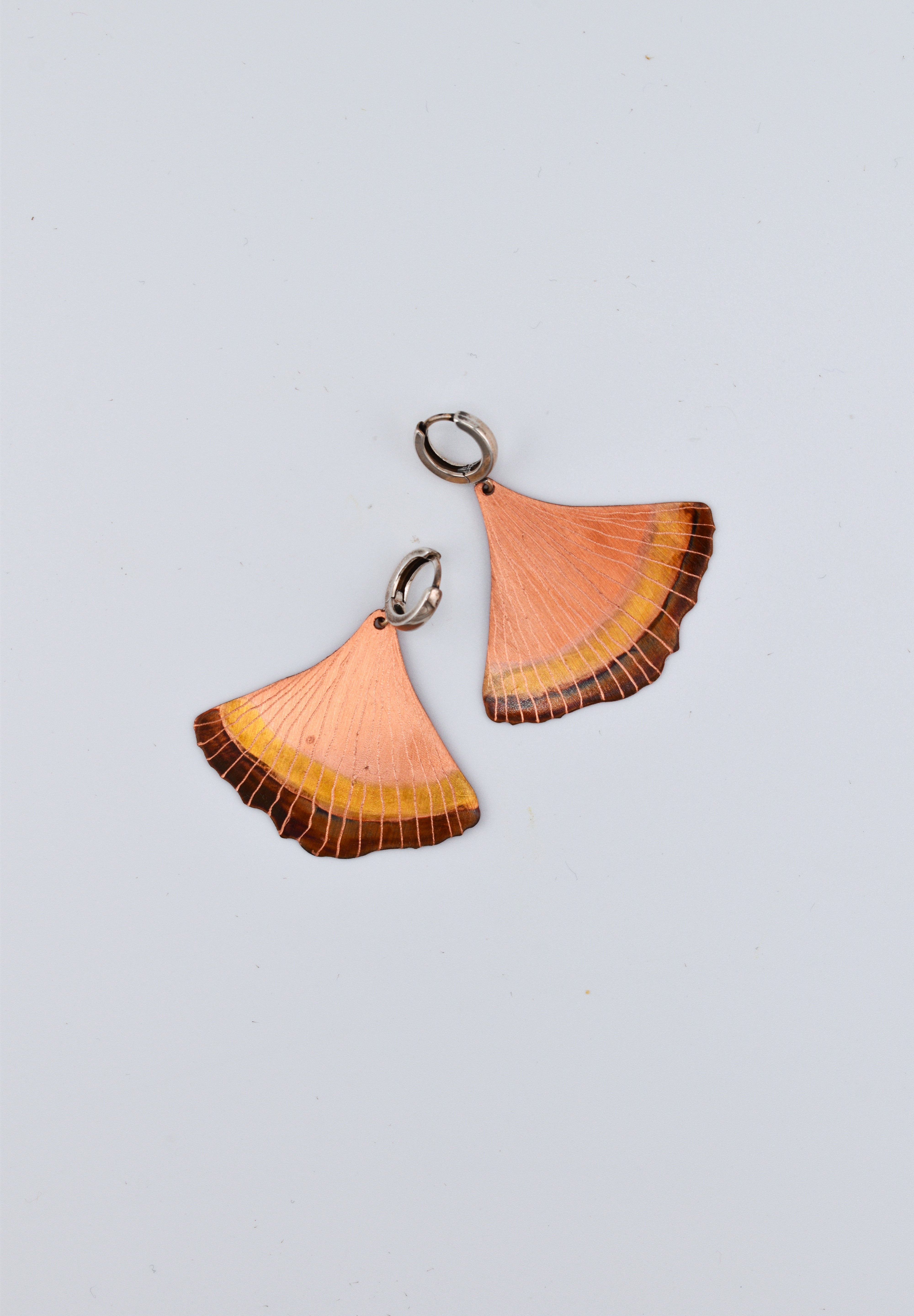 Kolczyki wiszące ze srebrnymi okrągłymi zapięciami wykonane z miedzi, częściowo pozłacane i oksydowane.